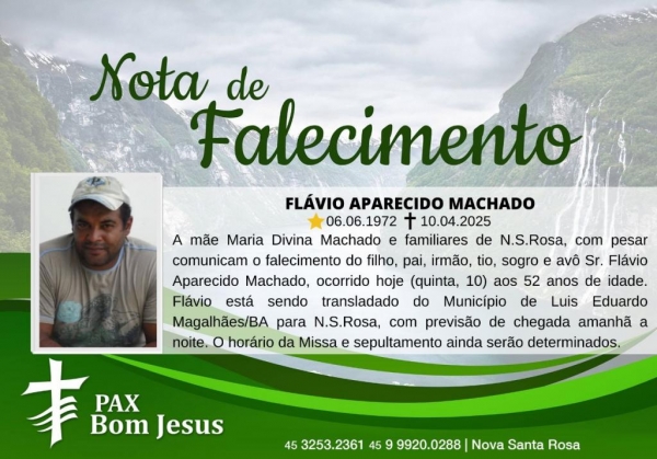 A mãe Maria Divina Machado e familiares de Nova SantaRosa, com pesar comunicam o falecimento do filho, pai, irmão, tio, sogro e avô Sr. Flávio Aparecido Machado, ocorrido hoje (10) aos 52 anos de idade.