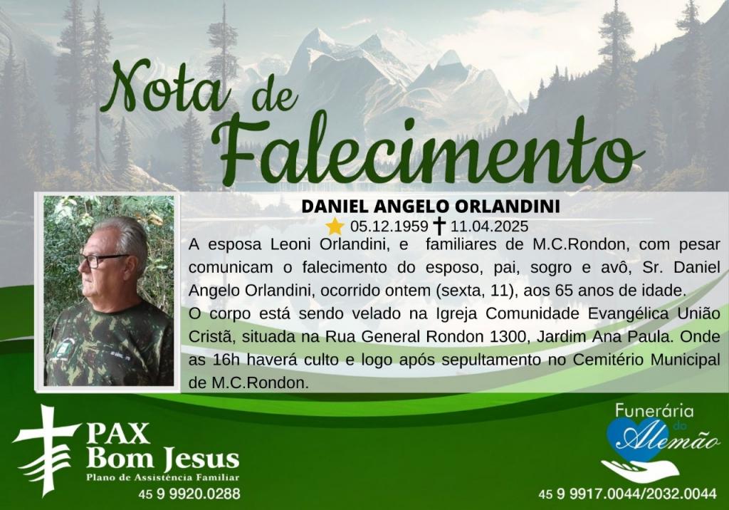 A esposa Leoni Orlandini, e familiares de Marechal Cândido Rondon, com pesar comunicam o falecimento do esposo, pai, sogro e avô, Sr. Daniel Angelo Orlandini, ocorrido ontem (11), aos 65 anos de idade.