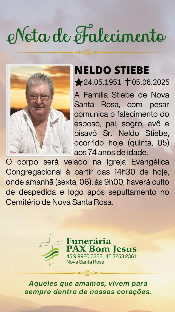 A Família Stiebe de Nova Santa Rosa, com pesar comunica o falecimento do esposo, pai, sogro, avô e bisavô Sr. Neldo Stiebe, ocorrido hoje (quinta, 05), aos 74 anos de idade.