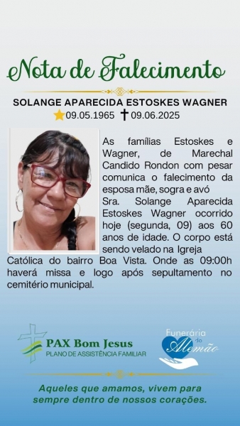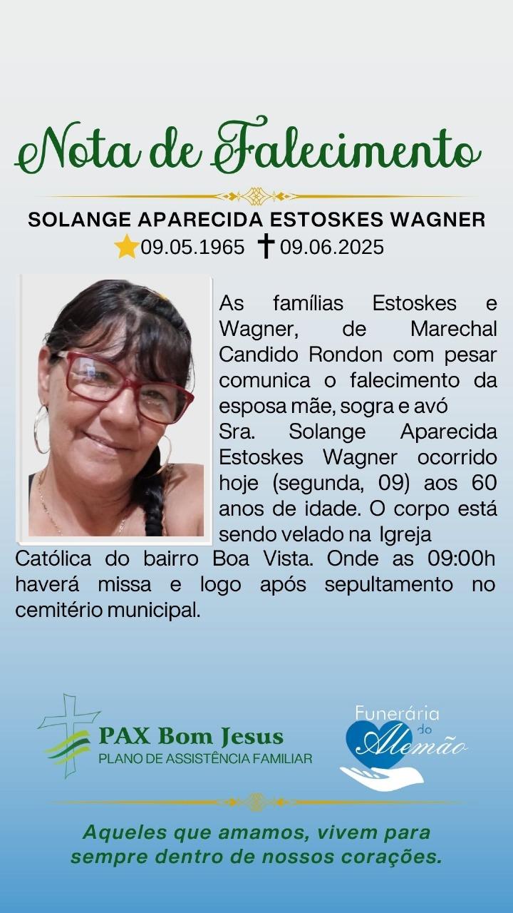 Sra. Solange Aparecida Estoskes Wagner ocorrido hoje (09) aos 60 anos de idade. O corpo está sendo velado na Igreja