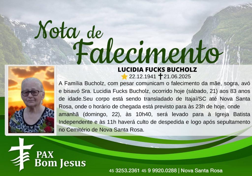 A Família Bucholz, com pesar comunicam o falecimento da mãe, sogra, avó e bisavó Sra. Lucidia Fucks Bucholz, ocorrido hoje (sábado, 21) aos 83 anos de idade.