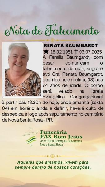 A Família Baumgardt com pesar comunica o falecimento da mãe, sogra e avó Sra. Renata Baumgardt, ocorrido hoje (quinta, 03) aos 74 anos de idade.