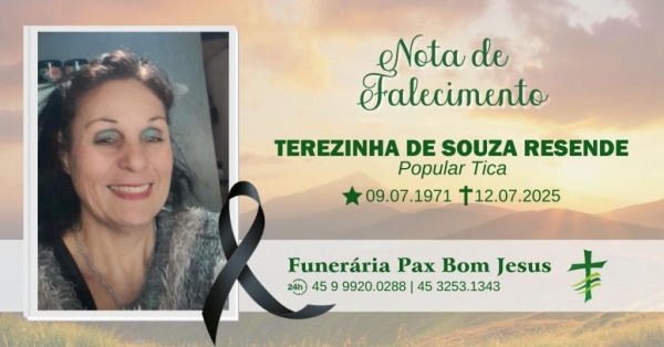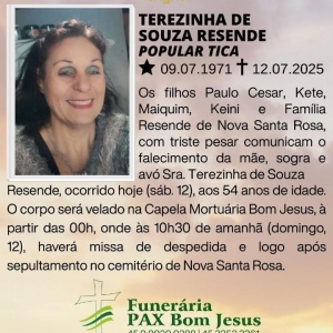 Os filhos Paulo Cesar, Kete, Maiquim, Keini e família Resende de Nova Santa Rosa, com triste pesar comunicam o falecimento da mãe, sogra e avó Sra. Terezinha de Souza Resende, ocorrido hoje (sáb. 12), aos 54 anos de idade.