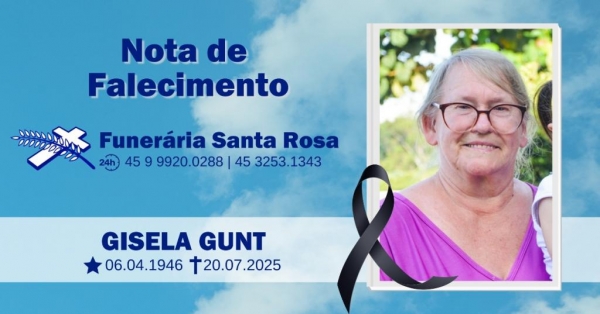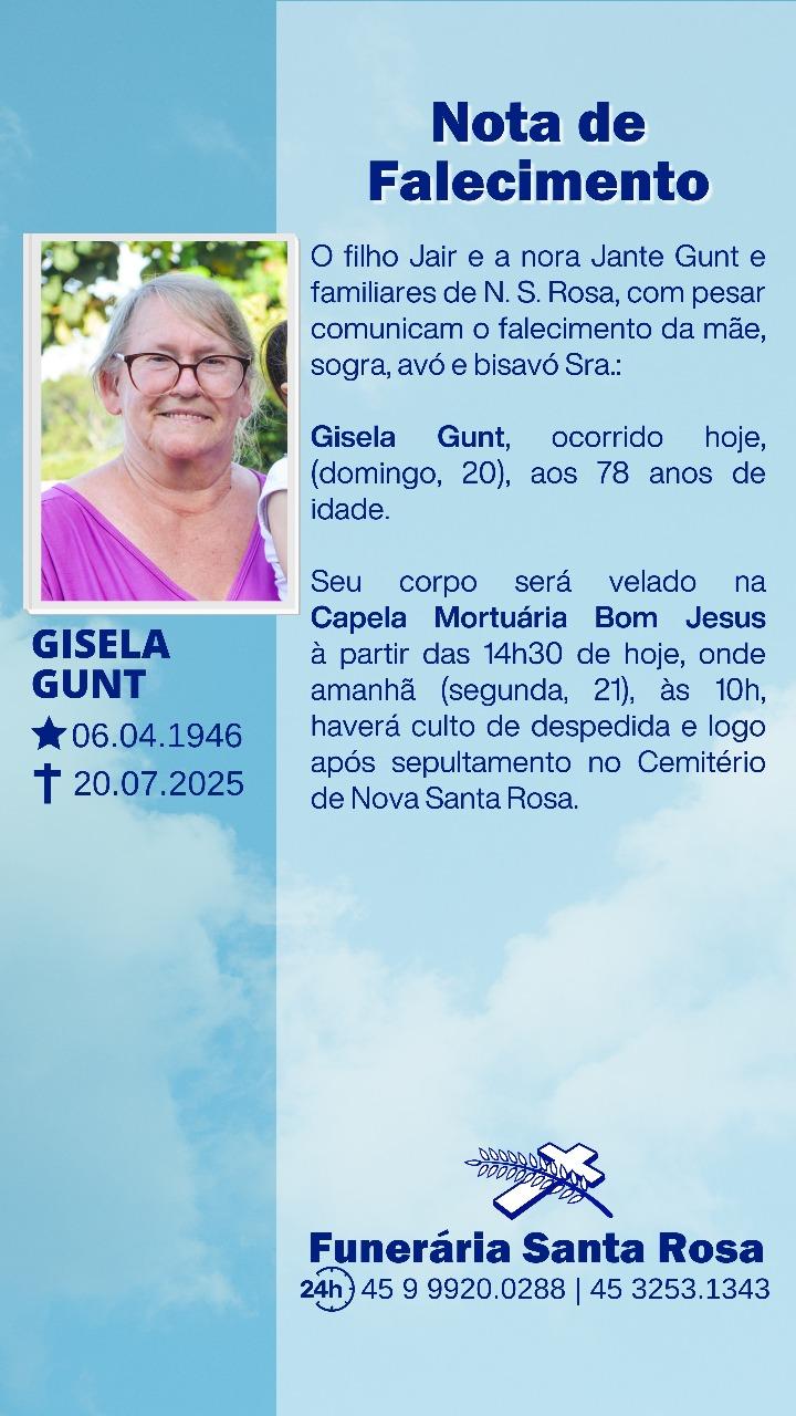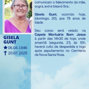 O filho Jair e a nora Jante Gunt e familiares de Nova Santa Rosa, com pesar comunicam o falecimento da mãe, sogra, avó e bisavó Sra. Gisela Gunt, ocorrido hoje (domingo, 20), aos 78 anos de idade.