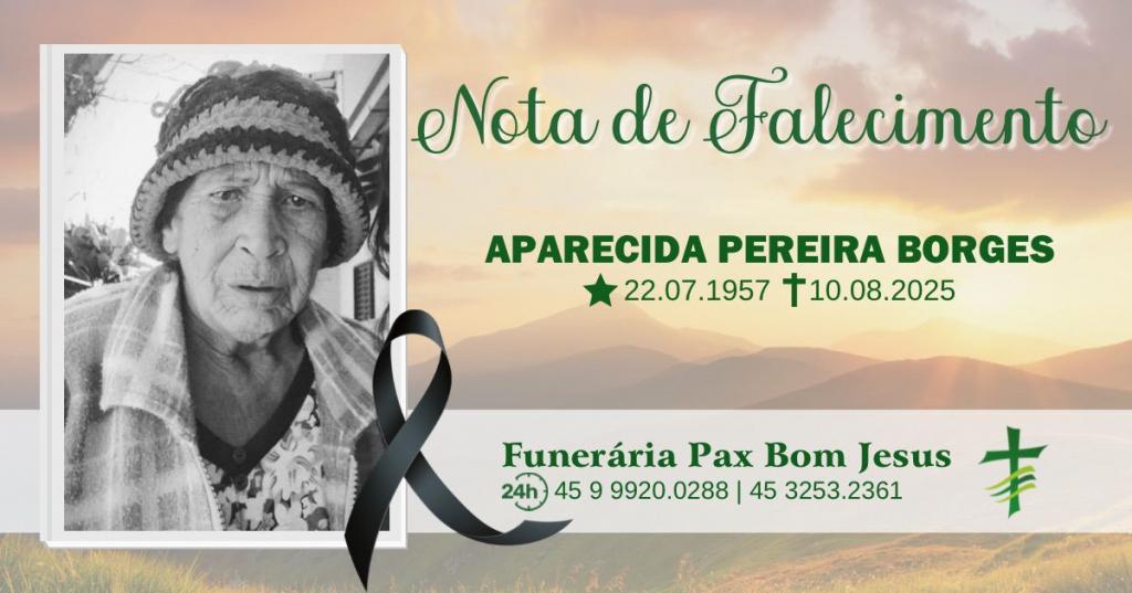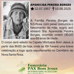 A Família Pereira Borges de N.S.Rosa, com pesar comunica o falecimento da mãe, sogra, avó ebisavó Sra. Aparecida Pereira Borges, ocorrido ontem (10) aos 68 anos de idade.