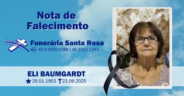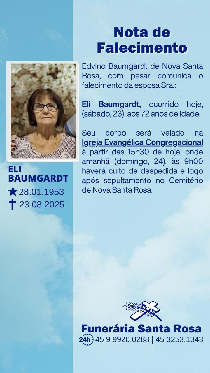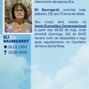 Edvino Baumgardt de Nova Santa Rosa, com pesar comunica o falecimento da esposa Sra. Eli Baumgardt, ocorrido hoje (sábado, 23), aos 72 anos de idade.