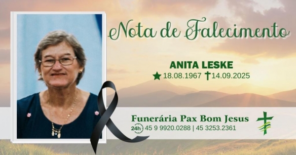 Os filhos Jairo e Sandra Gums juntamente com seus familiares de Planalto D’Oeste, com pesar comunicam o falecimeto da mãe, sogra e avó Sra. Anita Leske, ocorrido hoje (14.09) aos 58 anos de idade.