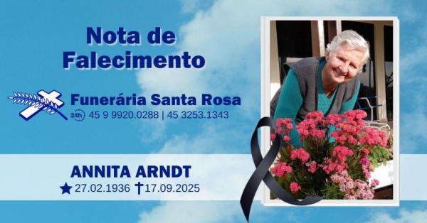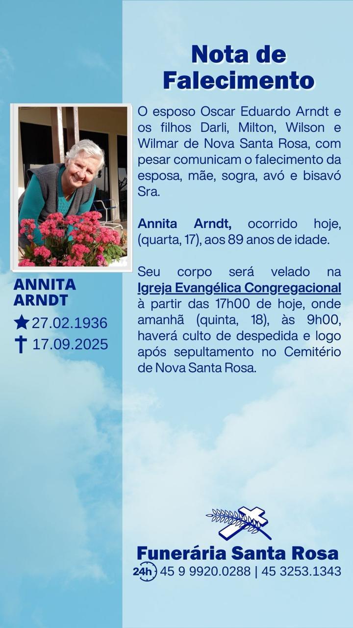 O esposo Oscar Eduardo Arndt e os filhos Darli, Milton, Wilson e Wilmar de Nova Santa Rosa, com pesar comunicam o falecimento da esposa, mãe, sogra, avó e bisavó Sra. Annita Arndt, ocorrido hoje (quarta, 17), aos 89 anos de idade.