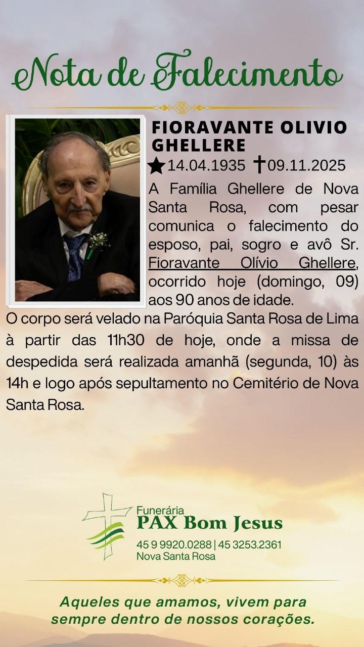 A Família Ghellere de Nova Santa Rosa, com pesar comunica o falecimento do esposo, pai, sogro e avô Sr. Fioravante Olívio Ghellere, ocorrido hoje (09) aos 90 anos de idade.