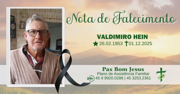 A Esposa Hilda juntamente com seus familiares, com pesar comunicam o falecimento do esposo, pai, sogro, avô e bisavô Sr. Valdimiro Hein, ocorrido hoje (1º) aos 72 anos de idade.