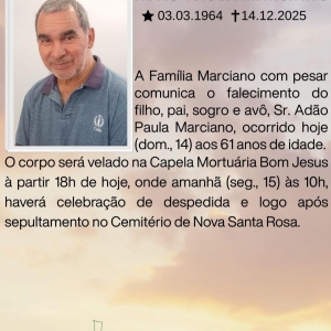 A Família Marciano com pesar comunica o falecimento do filho, pai, sogro e avô, Sr. Adão Paula Marciano, ocorrido hoje (14) aos 61 anos de idade.