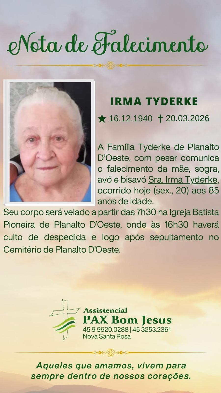 A Família Tyderke de Planalto D’Oeste, com pesar comunica o falecimento da mãe, sogra, avó e bisavó Sra. Irma Tyderke, ocorrido hoje (20) aos 85 anos de idade.