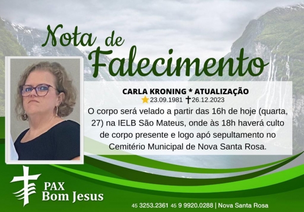 O pastor Jonas Schultz da Igreja Evangélica Luterana do Brasil, Congregação São Mateus, juntamente com os familiares de Carla Kroning, comunicam que o corpo será velado a partir das 16h00 de hoje (quarta-feira, 27) na IELB São Mateus, onde às 18h00 haverá culto de corpo presente e logo após sepultamento no Cemitério Municipal de Nova Santa Rosa.