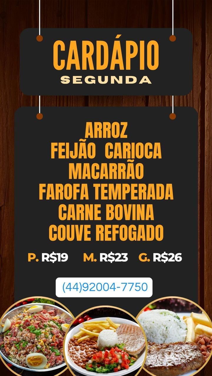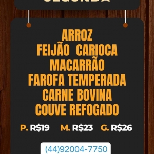 No cardápio desta segunda-feira, os clientes puderão saborear arroz, feijão carioca, macarrão, farofa temperada, carne bovina e couve refogada. Os preços são acessíveis: pequena por R$ 19, média por R$ 23 e grande por R$ 26.