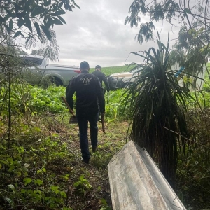 Durante as buscas, os agentes identificaram uma cova contendo fragmentos de ossos humanos, entre eles um fêmur e vértebras cervicais.