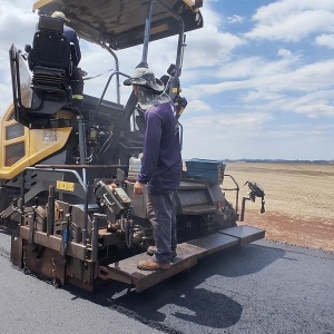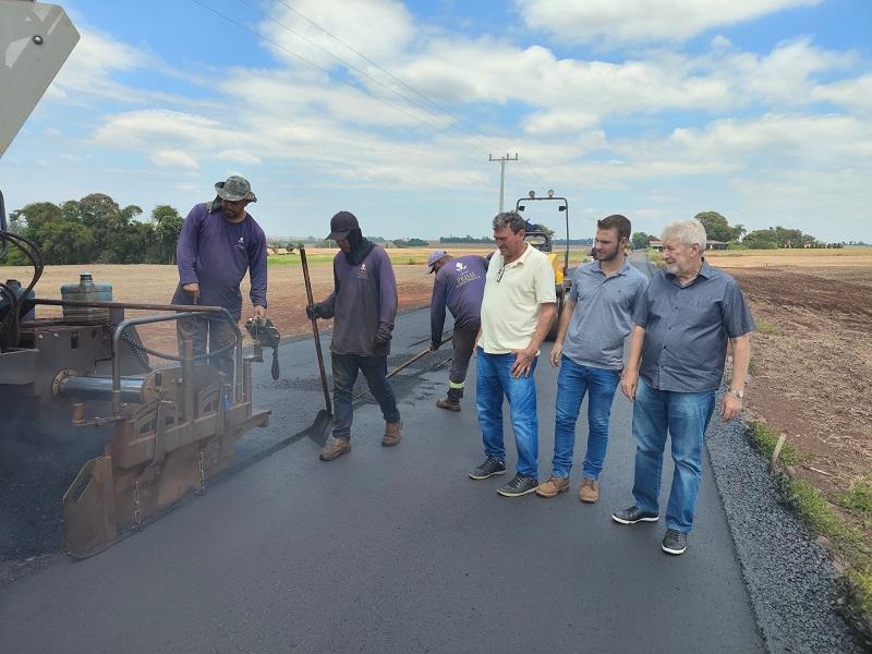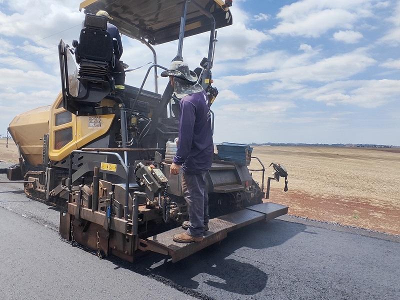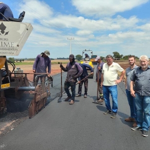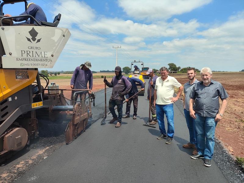 As obras de pavimentação asfáltica no trecho 2 da Linha Brasil, interior de Nova Santa Rosa, seguem avançando. No momento, está sendo feita a etapa de revestimento em CBUQ (Concreto Betuminoso Usinado a Quente), com uma camada de cinco centímetros. Em uma etapa anterior, esse trecho recebeu uma base de 10 centímetros de brita graduada.