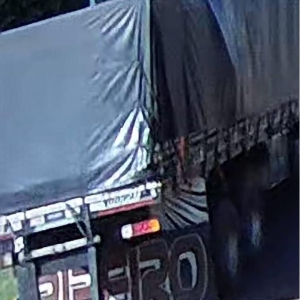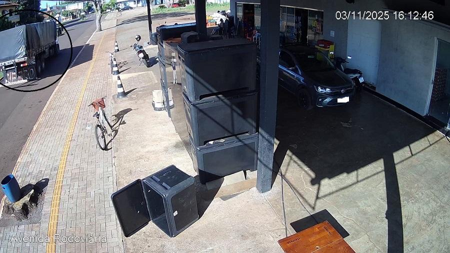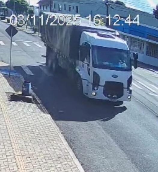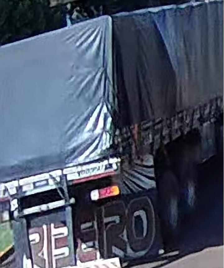 Imagens fornecidas pela câmera de segurança do local registraram o momento do impacto e o caminhão em fuga. Pelas fotografias, é possível descrever características úteis para identificação: trata-se de um veículo de carga com cabine na cor branca, frente com design que remete a caminhões comerciais modernos (sem confirmação de marca), carroceria com cobertura em lona escura e conjunto de eixos traseiros compatível com caminhão-trucado ou cavalo-trator com semirreboque. A tarpaulin/ lona e a configuração do conjunto podem ajudar na identificação do veículo.