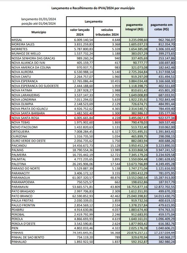 Segundo o balanço, o município de Nova Santa Rosa tem o valor total de R$ 6.005.665,84 lançado neste ano de 2024, referente à 4.228 veículos tributados.