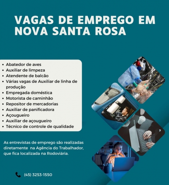 As entrevistas de emprego são realizadas diretamente na Agência do Trabalhador, que funciona junto à Rodoviária de Nova Santa Rosa. Os interessados devem comparecer ao local para obter mais informações sobre as vagas e os requisitos exigidos para cada função.