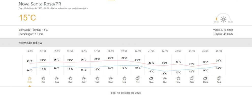 A semana começa com tempo firme e temperaturas agradáveis em Nova Santa Rosa, no Oeste do Paraná. Nesta segunda-feira (12), os termômetros devem variar entre 14°C e 25°C, com predomínio de sol e algumas nuvens no céu.