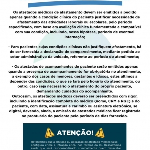 Também são reforçados os critérios para emissão de atestados destinados a acompanhantes, que só devem ser fornecidos quando a presença do responsável for indispensável, como em atendimentos a menores, gestantes ou idosos, ou quando o paciente necessitar de cuidados específicos.