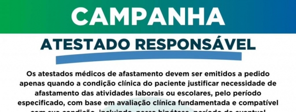 De acordo com o documento, a campanha destaca que os atestados de afastamento devem ser emitidos somente quando a condição clínica do paciente justificar a necessidade de interrupção das atividades laborais ou escolares, sempre com avaliação técnica adequada. Nos casos em que não há indicação de afastamento, o usuário deve receber declaração de comparecimento, mediante solicitação ao setor administrativo.