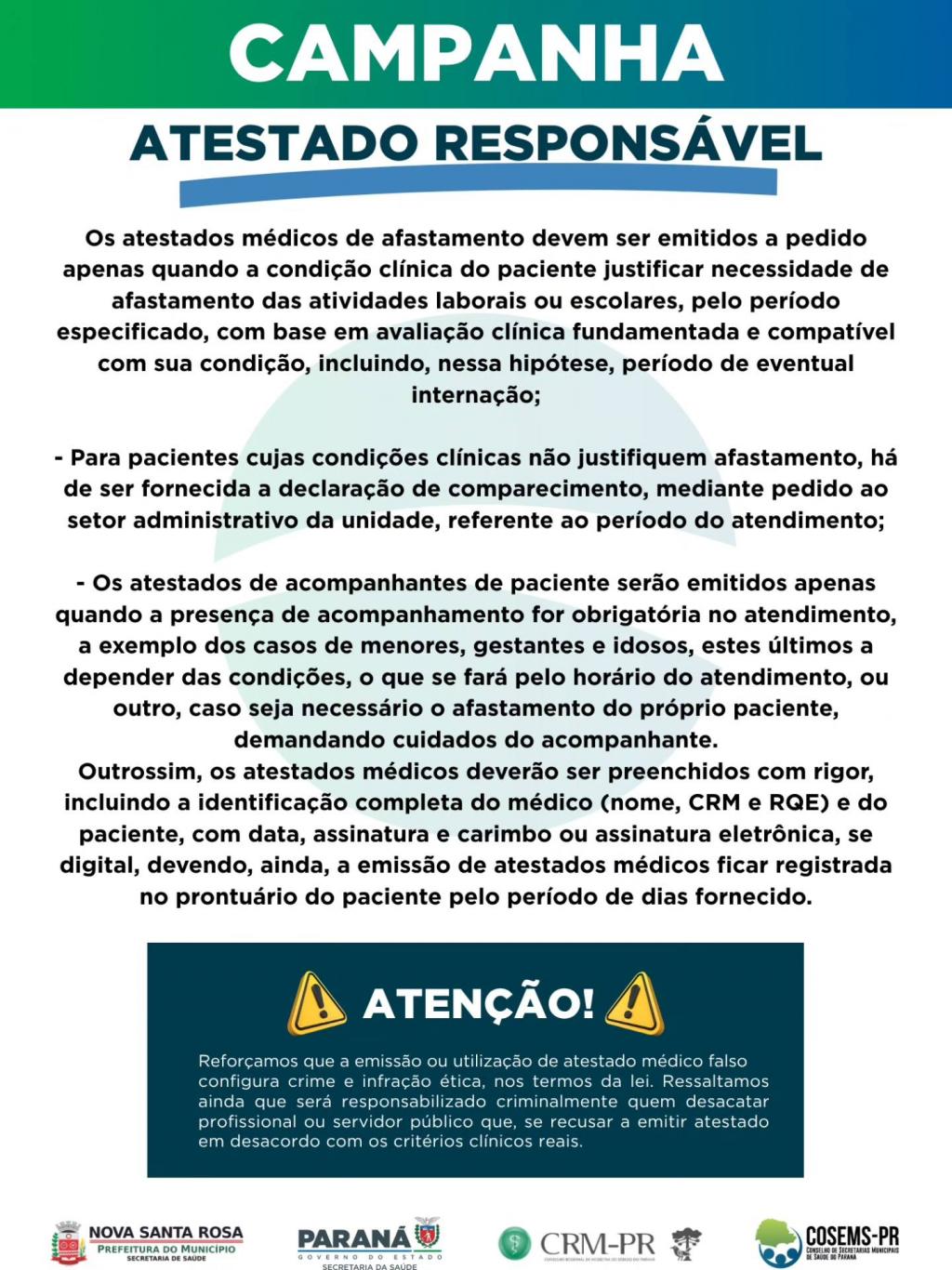 A Secretaria de Saúde de Nova Santa Rosa informa que recebeu um comunicado do Conselho Regional de Medicina do Paraná (CRM PR), solicitando a adesão para a campanha "Atestado Responsável". A ação reforça orientações sobre a correta emissão de atestados médicos, garantindo ética, segurança e responsabilidade no atendimento à população.