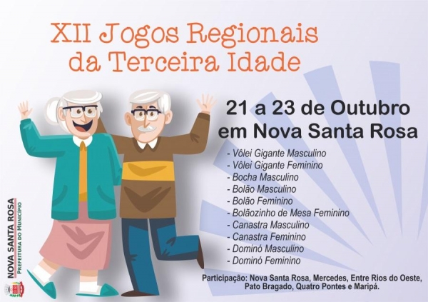 O município de Nova Santa Rosa será sede da 12ª Edição dos Jogos Regionais da Terceira Idade. A abertura oficial da competição será na terça-feira (22) às 8 horas no Ginásio de Esportes Eurides Priebe.