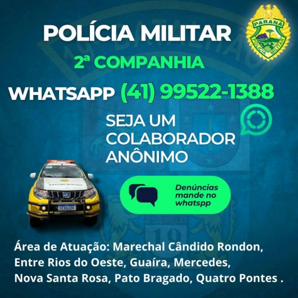Sendo assim, se você tem conhecimento ou informações de: locais onde há o comércio ilegal de drogas, foragidos da Justiça, depósitos de drogas ou contrabandos, pessoas armadas, locais onde possam estar veículos, produtos de furto/roubo, entre outros crimes, denuncie através do DISQUE DENÚNCIA da 2ª CIA/19º BPM.