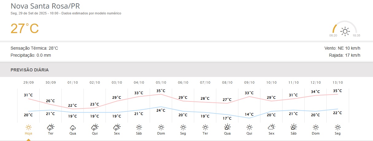 A previsão do tempo para Nova Santa Rosa nesta semana, de acordo com dados do Simepar, indica variação significativa de temperaturas, com dias de calor intenso intercalados por momentos de instabilidade.