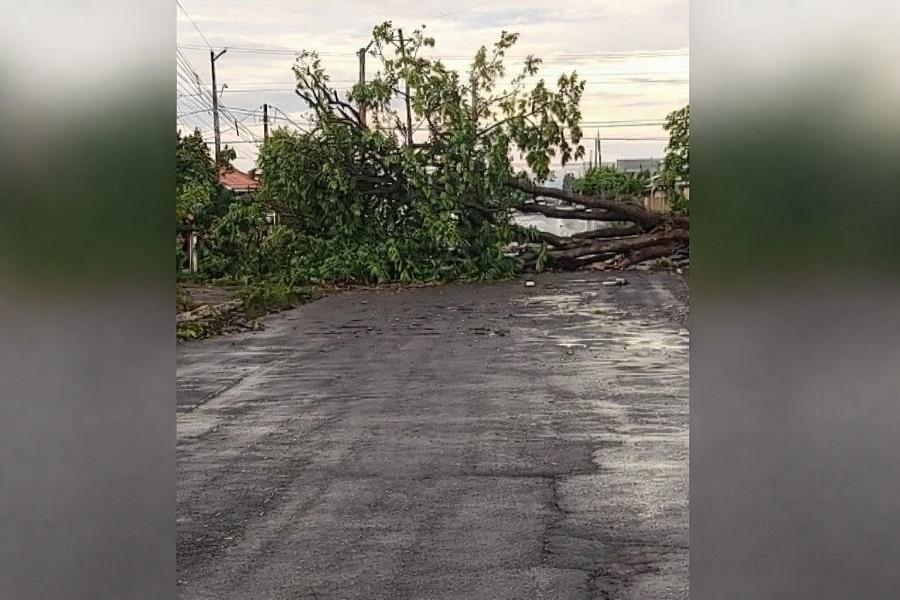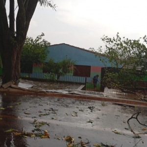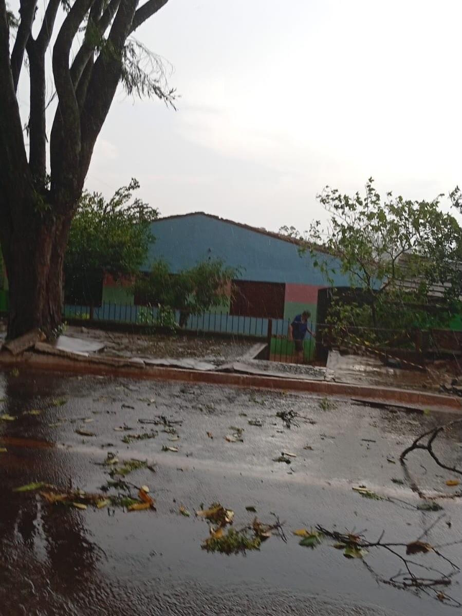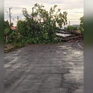 Na área urbana, os danos também foram registrados. Nas proximidades da Prefeitura, uma árvore de grande porte foi arrancada pela força do vento e caiu sobre a rua. Outras árvores também vieram abaixo durante o temporal.