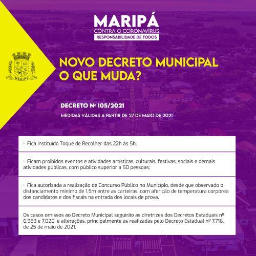 Começou a valer a partir da tarde desta quinta-feira (27) o Decreto Municipal nº 105/2021, que altera algumas medidas relacionadas à pandemia da Covid-19. As alterações foram propostas e aprovadas em reunião do Comitê Gestor Municipal do Plano de Contingenciamento em Saúde da Covid-19 e consideram a adaptação das medidas ao último Decreto Estadual, publicado na terça-feira (25).
