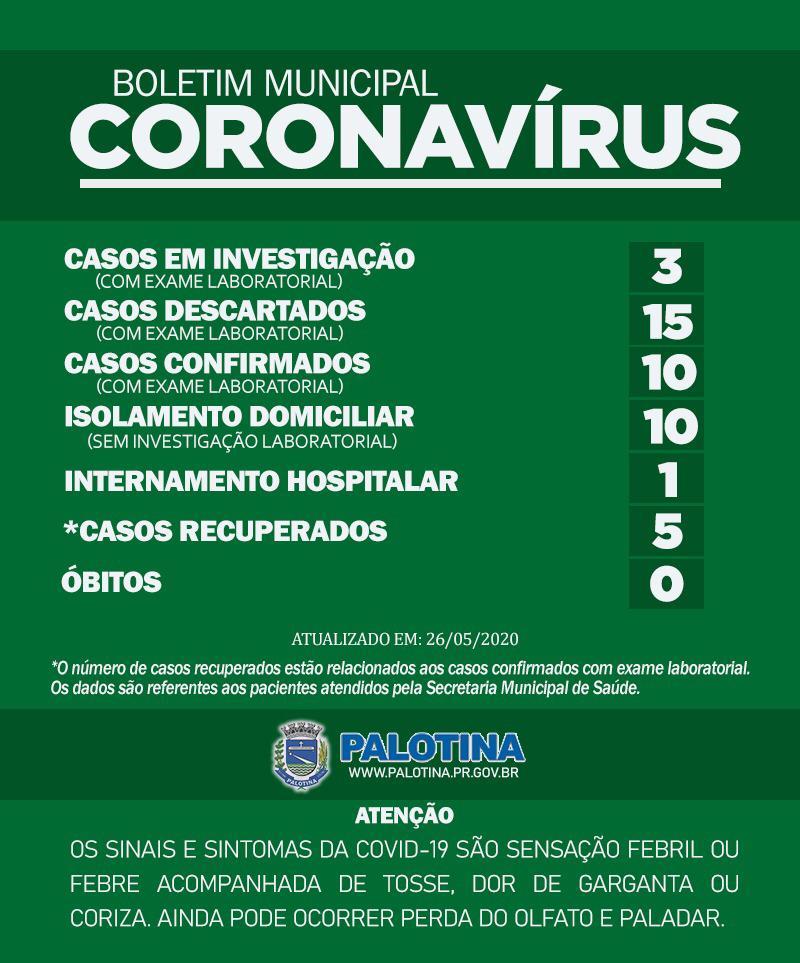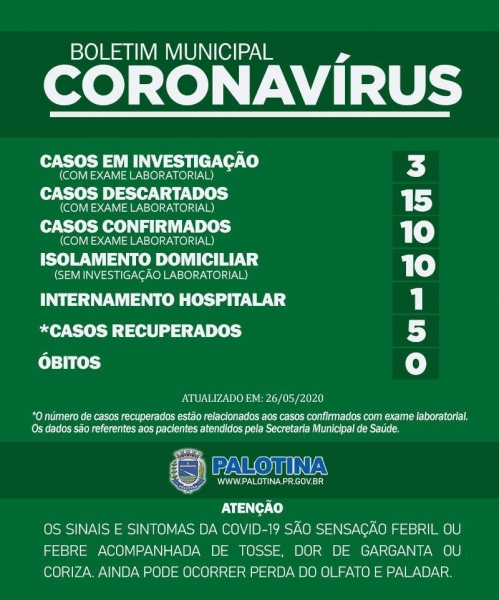A secretaria municipal de Saúde de Palotina informa que na manhã desta terça-feira (26), recebeu informação da 20ª Regional de Saúde de mais dois casos positivos para COVID-19.