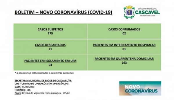 Cascavel agora tem 275 casos suspeitos do novo coronavírus (covid-19), 58 a mais do que ontem (23). O número consta no boletim oficial desta terça-feira (24), divulgado há pouco pelo Centro de Operações em Emergências (COE) da Secretaria de Saúde de Cascavel.