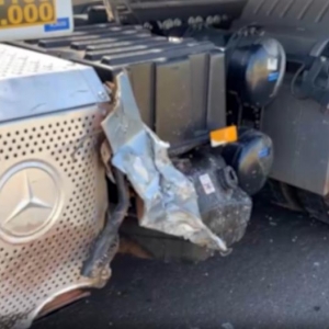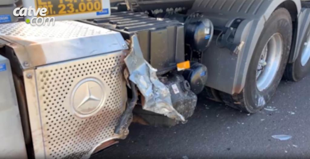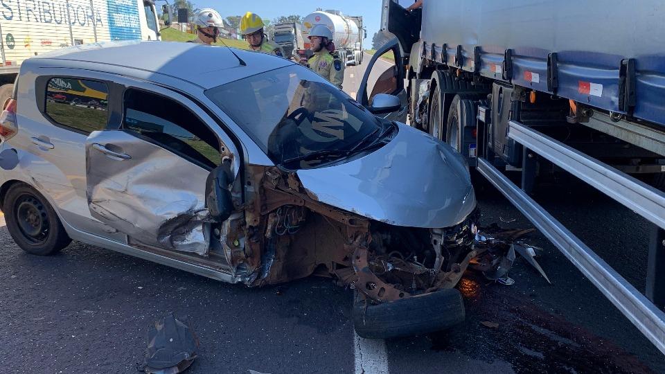 Uma batida envolvendo uma carreta e um Fiat Mobi foi registrada, nesta sexta-feira (15), no Viaduto da Petrocon, na BR-277, em Cascavel.