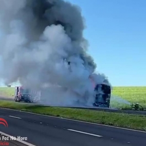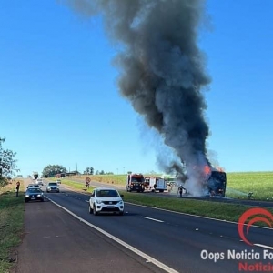 Ônibus de viagem pegou fogo na BR 277, entre Medianeira e São Miguel do Iguaçu, na tarde desta terça-feira (13).
