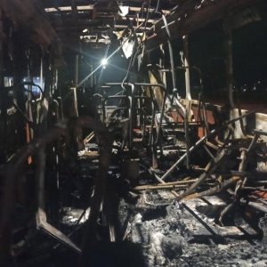 Um ônibus de transporte coletivo urbano de Toledo ficou totalmente destruído por um incêndio na noite desta segunda-feira nas margens da rodovia PR 182 que liga Toledo ao município de Palotina em frente ao Bio Park.