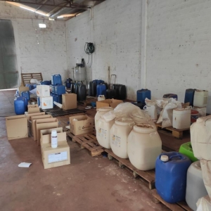 A ação fiscal revelou a presença de uma fábrica clandestina de envase, manipulação e fabricação de insumos agrícolas, agrotóxicos, fertilizantes e adjuvantes em outro barracão. Foram encontrados agrotóxicos vencidos, embalagens sem identificação do fabricante, além de equipamentos para mistura de produtos sólidos e líquidos.
