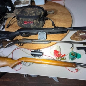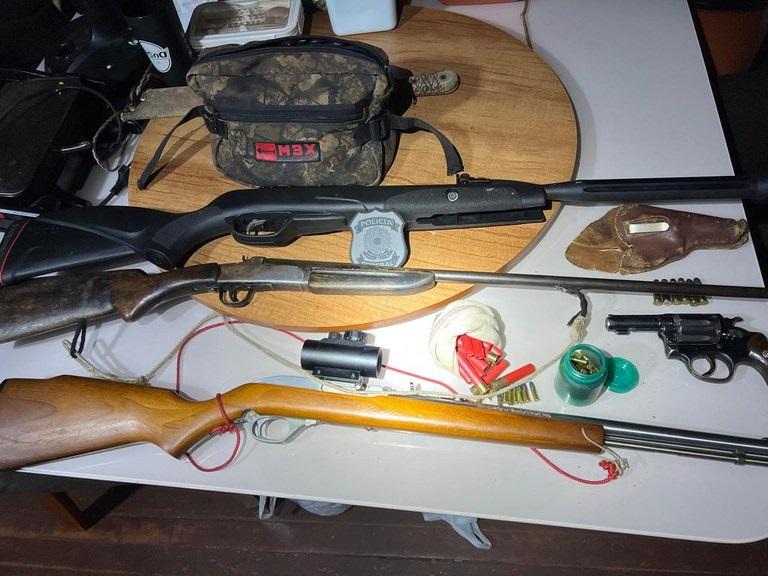 Durante o cumprimento dos mandados, um dos investigados foi preso em flagrante por posse ilegal de arma de fogo. No imóvel, também foram apreendidos quatro armas, munições, carne de animais silvestres congelada e petrechos utilizados em rinha de galos. Em uma das residências, as equipes localizaram ainda uma estrutura destinada à prática de briga de galos.