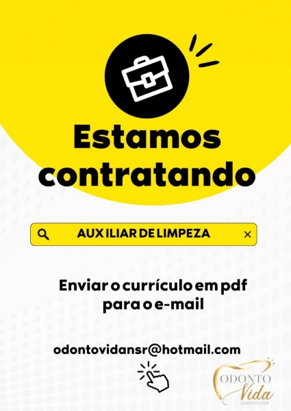 A Odonto Vida de Nova Santa Rosa está com uma oportunidade de trabalho para auxiliar de limpeza, os interessados devem entrar em contato por e-mail enviando o seu currículo em PDF para o endereço odontovidansr@hotmail.com.