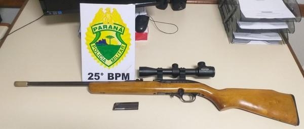 Dentro da residência do suspeito, a PM encontrou uma espingarda com carregador.