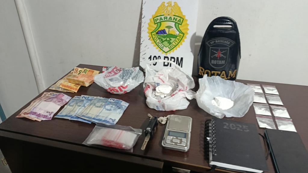 Ele ainda revelou que havia mais entorpecentes em sua residência, localizada em Toledo. Com autorização de um familiar que reside no local, os policiais entraram na casa e encontraram uma balança de precisão, oito porções de cocaína embaladas em zip lock (totalizando 8 gramas) e uma porção maior em pedra bruta (41 gramas).