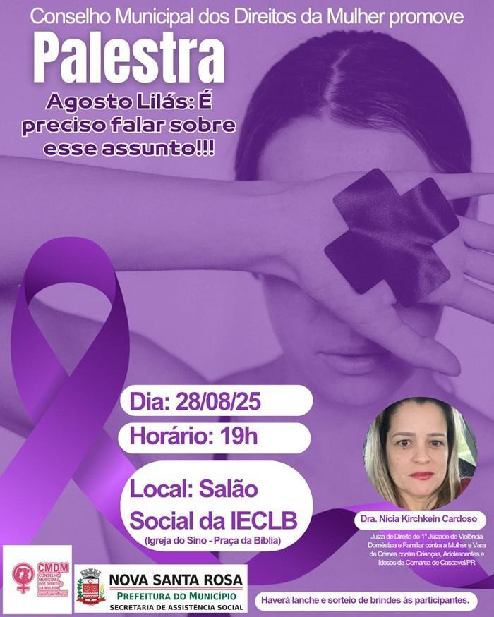 Nesta quinta-feira, dia 28 de agosto, Nova Santa Rosa recebe uma importante palestra dentro da campanha Agosto Lilás, que busca conscientizar a sociedade sobre o combate à violência contra a mulher. A atividade será promovida pelo Conselho Municipal dos Direitos da Mulher e acontece a partir das 19h, no Salão Social da IECLB (Igreja do Sino, na Praça da Bíblia).