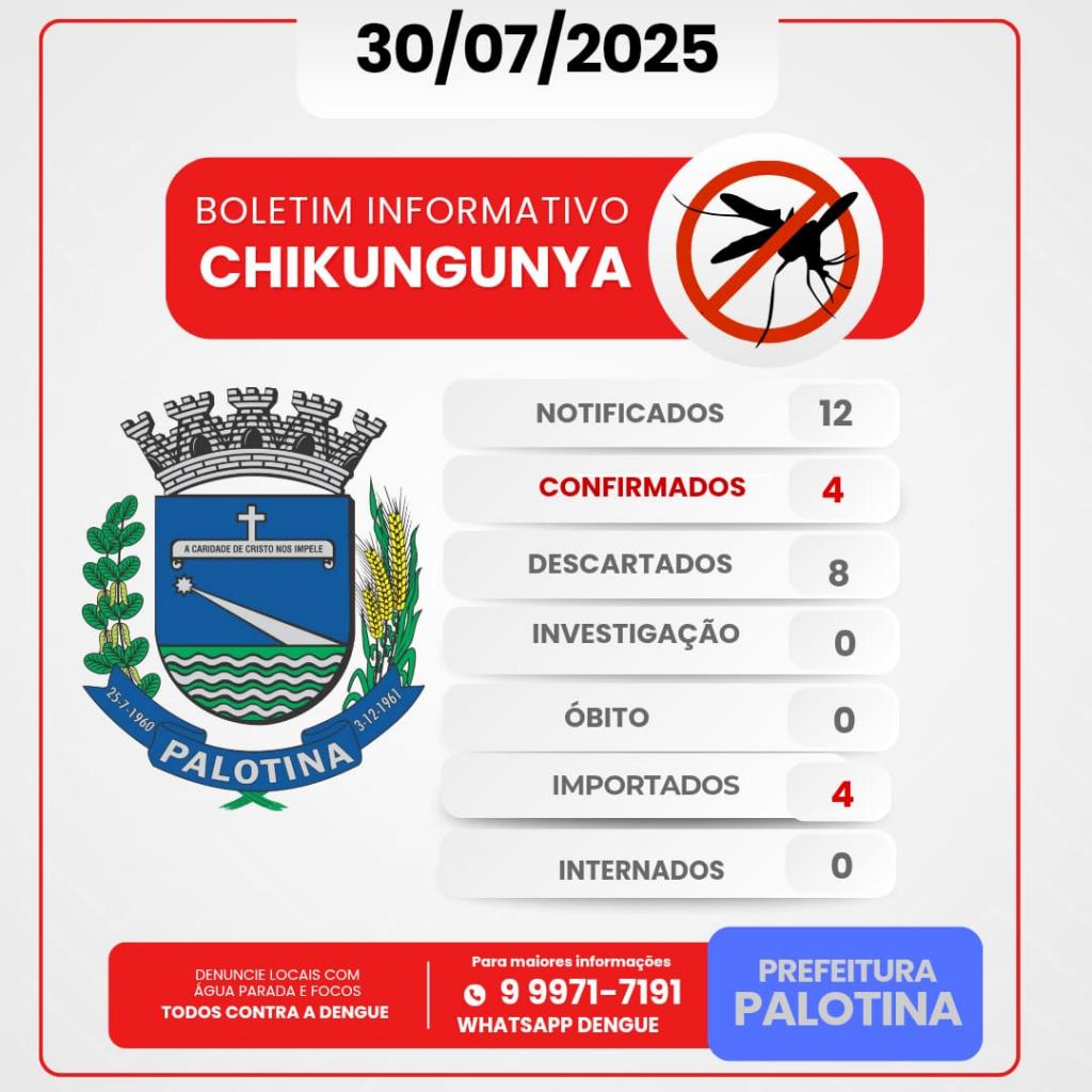 A Prefeitura de Palotina, por meio da Secretaria Municipal de Saúde, divulgou nesta quarta-feira (30) o novo boletim epidemiológico com dados atualizados sobre os casos de Dengue e Chikungunya no município.