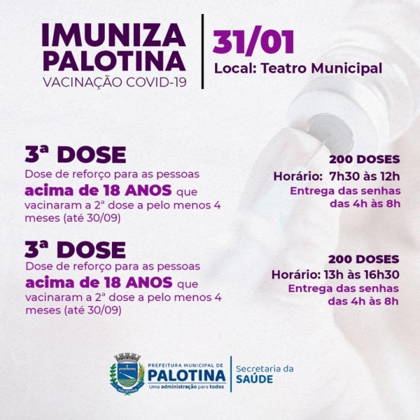 A direção da Secretaria Municipal de Saúde de Palotina informa que na segunda-feira, dia 31 de janeiro, a equipe de vacinação vai aplicar somente a dose de reforço (3ª dose), da vacina contra a covid-19 nos palotinenses a partir dos 18 anos de idade que receberam a segunda dose até o dia 30 de setembro.