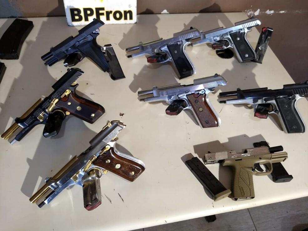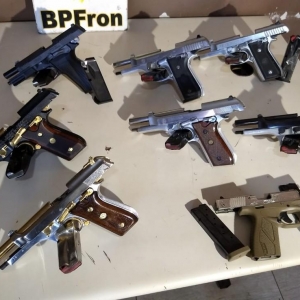Segundo o Batalhão de Polícia de Operações da Fronteira (BPFron), as mulheres foram flagradas com sete pistolas 9 mm, uma pistola .40 e dez carregadores de fuzil. Duas armas apreendidas foram, aparentemente, banhadas a ouro.
