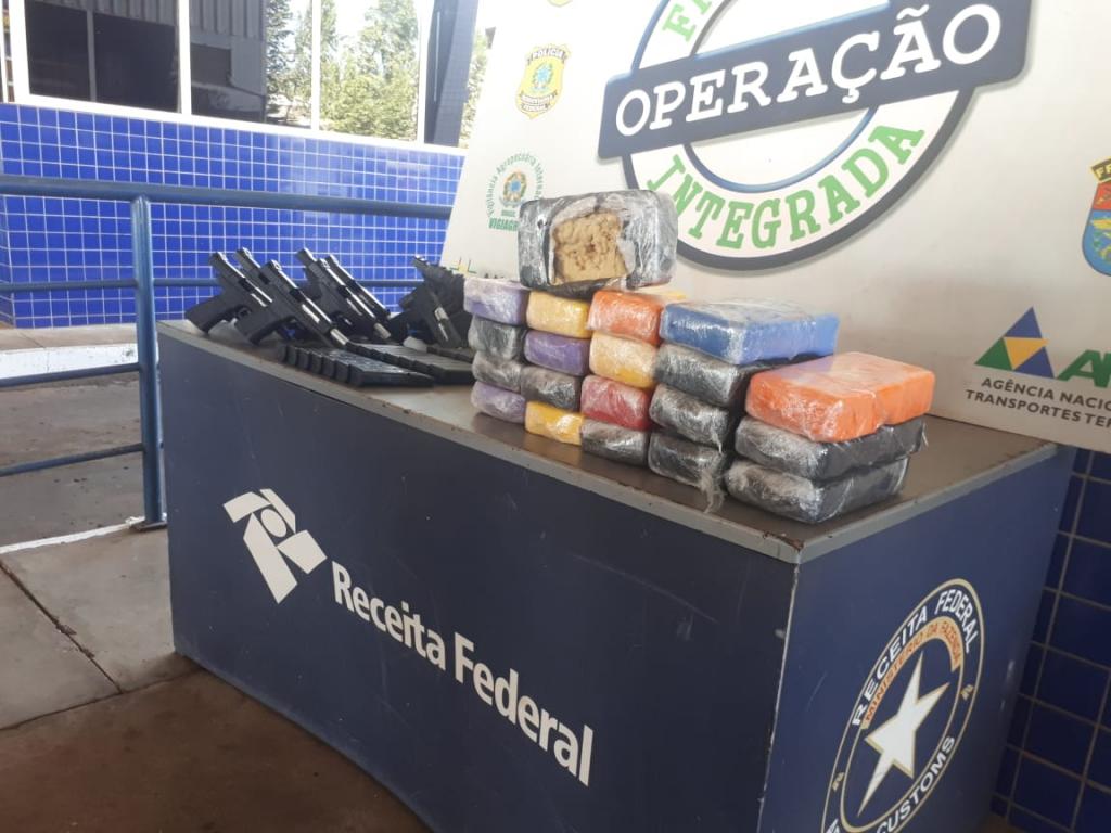Durante a busca no veículo foi encontrado um fundo falso que estava carregado com 21,01 quilogramas de Crack divididos em 20 tabletes, 06 pistolas 9mm Glock, 07 pistolas 9mm Girsan de origem Turca, 26 carregadores de pistola 9mm e 05 carregadores de fuzil 556 e também 40 munições de fuzil calibre 223.