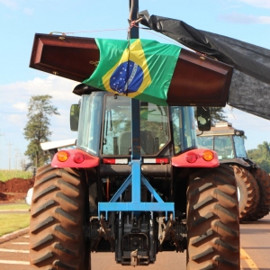 Um caixão com a bandeira do Brasil em volta chama atenção das pessoas que passam pelo local.