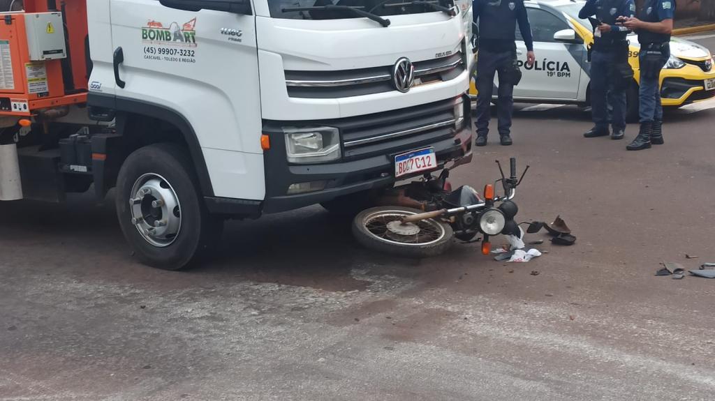 O caminhão Volkswagen delivery com placas Mercosul por pouco não passa por cima de uma moto Honda CG de 150 cilindradas placa do Toledo conduzida por uma mulher de 57 anos.