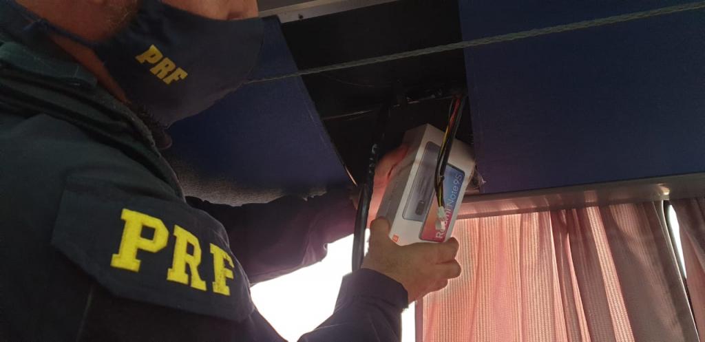 Dando continuidade a fiscalização ao veículo foram encontrados, ainda, alguns indícios que levaram a uma fiscalização minuciosa no duto de ar-condicionado, onde foram localizados vários celulares de origem estrangeira, não sendo identificado o responsável pelos mesmos.